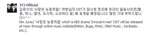 [Trad] La canción de Kim Junsu “사랑 은 눈꽃 처럼”, que es parte del OST del drama “Innocent man” de la KBS, será lanzada al medio día a través de webs de música online (Melon, Bugs, Mnet, Olleh Música, Soribada .. etc).