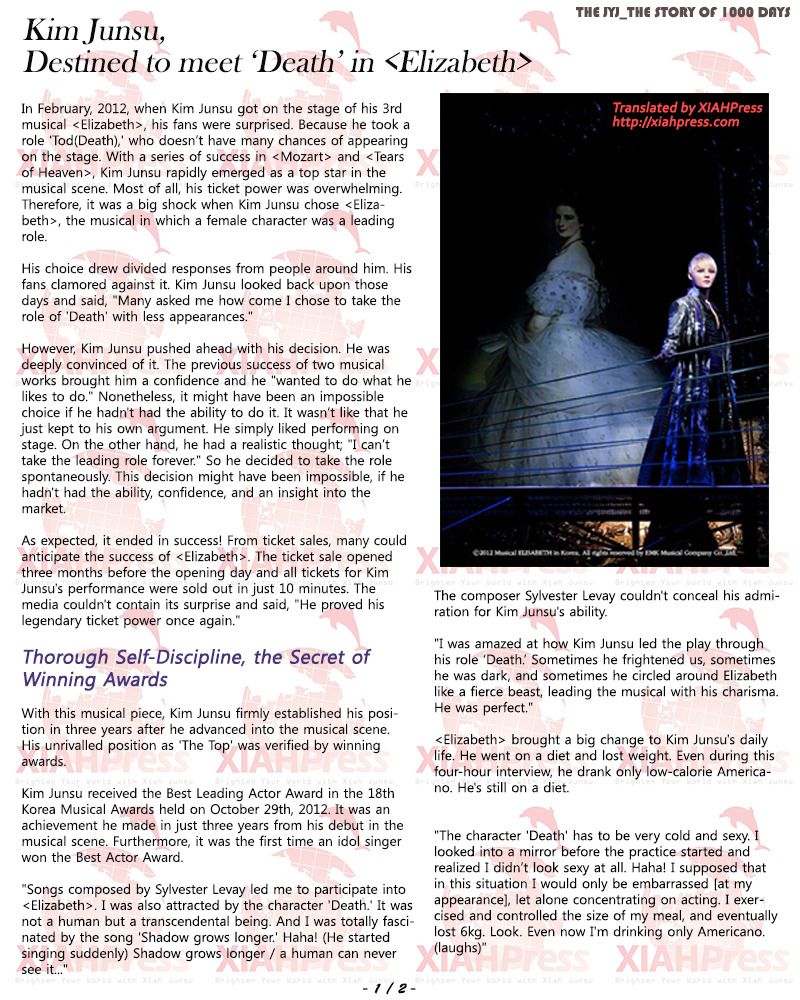 En Febrero,2012, cuando Kim Junsu subió al escenario de su 3er musical <Elizabeth>, sus fans estaban sorprendidas. Debido a que él tomo un personaje 'Tod (La muerte)', Que no tiene muchas oportunidades de aparición en el escenario. Con una serie de sucesos en <Mozart> y <Tears of Heavn>, Kim Junsu rapidamente emergío como una estrella top en la escena musical.Más que nada, su poder de venta de tickets fue abrumador. Por lo tanto, fue un gran shock cuando Kim Junsu eligió <Elizabeth>, el musical en el cual el personaje femenino era un papel destacado.