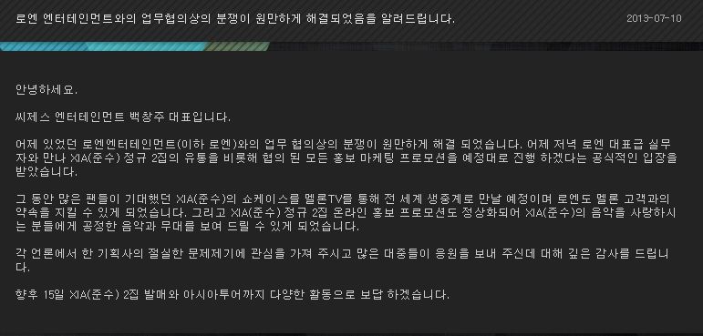 Ayer nuestra disputa de consultoría de negocio con LOEN entertainment ha sido resuelta de manera amistosa. Ayer en la noche, Los ejecutivos de LOEN se reunieron con nuestros representantes y oportunamente, hemos decidido la posición oficial para seguir adelante con todas las actividades promocionales de comercialización así como la distribución online y offline del 2do álbum de XIA (Junsu).