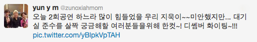 Nuestro Jiwookie que tuvo momentos difíciles debido a que hizo 2 presentaciones hoy~~ Incluso a pesar de que me siento apenada…tome una foto con Junsu en la sala de espera para todas/os que estaban curiosos~! ¡¡¡‘December’ fighting~!!!