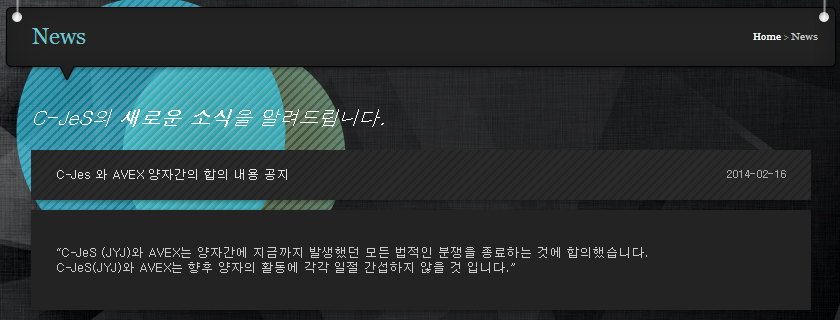 “C-JeS (JYJ) y AVEX han llegado a un acuerdo en terminar con todas las disputas legales que han ocurrido hasta ahora entre los dos.