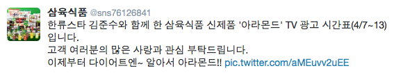 [TRAD]El anuncio televisivo del nuevo producto alimenticio de Sahmyook ‘Aramond’, con la estrella Hallyu Kim Junsu, saldrá al aire el 7~13 de abril. Pedimos a todos por su amor e interés.