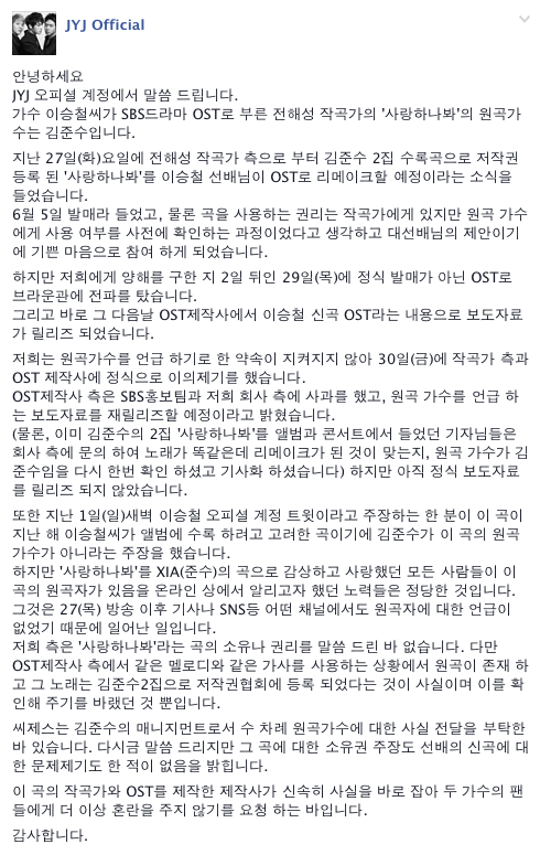 No podemos hablar con respecto al propietario de derechos de la canción. Sin embargo, en está situación dónde la canción de una misma melodía y letra han sido lanzadas por una compañía de producción de OST, afirmamos el hecho innegable de que una canción original existe y que está canción está protegida por derechos de autor bajo el nombre del segundo álbum de kim junsu con la asociación de derechos de autor de música de corea** y solo deseamos que esto se confirme.