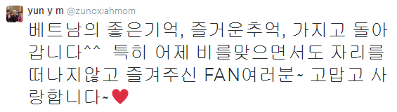 [TRAD] Los buenos y felices recuerdos de Vietnam, estoy regresando a ellos^^ Especialmente a todas las FANs por permanecer en sus asientos y disfrutar [el concierto] mientras incluso daban la bienvenida a la lluvia ayer~ gracias y los amo~