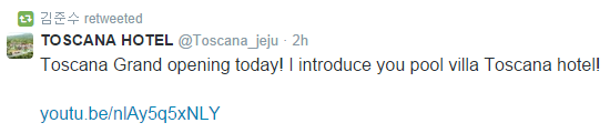 [TWITTER] 140925 Kim Junsu Twitter Actualización: Retweeteo el tweet del hotel Toscano