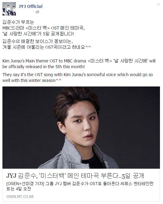 [FACEBOOK] 141104 Actualización del facebook Oficial de JYJ : Kim Junsu cantará la canción del tema principal para ‘Mr. Baek’