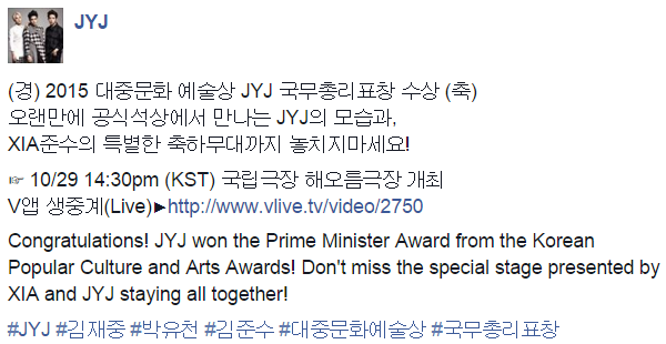 [FACEBOOK] 151029 Actualización del Facebook oficial de JYJ: Ve a JYJ en vivo en los '2015 Korean Popular Culture & Arts Awards' está noche!