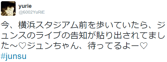 En este momento, cuando estaba caminando frente al estadio de Yokohama , el anuncio para el concierto en vivo de Junsu estaba colocado〜♡ Jun-chan, estoy esperando por ti ♡