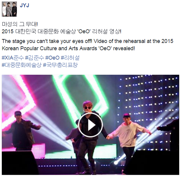 [FACEBOOK + VIDEO] 151031 JYJ Official Facebook actualización: ensayo de Junsu ‘OeO’ para los 2015 KPCAA