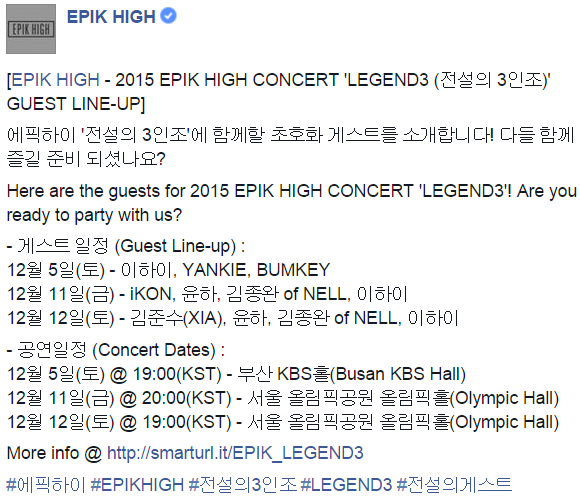 [EPIK HIGH – 2015 EPIK HIGH CONCERT ‘LEGEND3 (전설의 3인조)’ GUEST LINE-UP]
